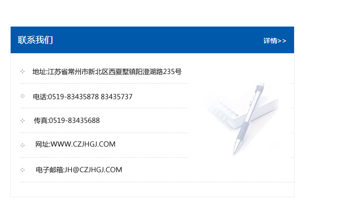 地址:常州市新北區友邦商務大廈1幢16、17層  電話:0519-85101652  傳真:0519-85112595  郵編:213022  網址:www_cz-jiayue_cn.dbhmjj.com  郵箱:xiajifengaa@163.com